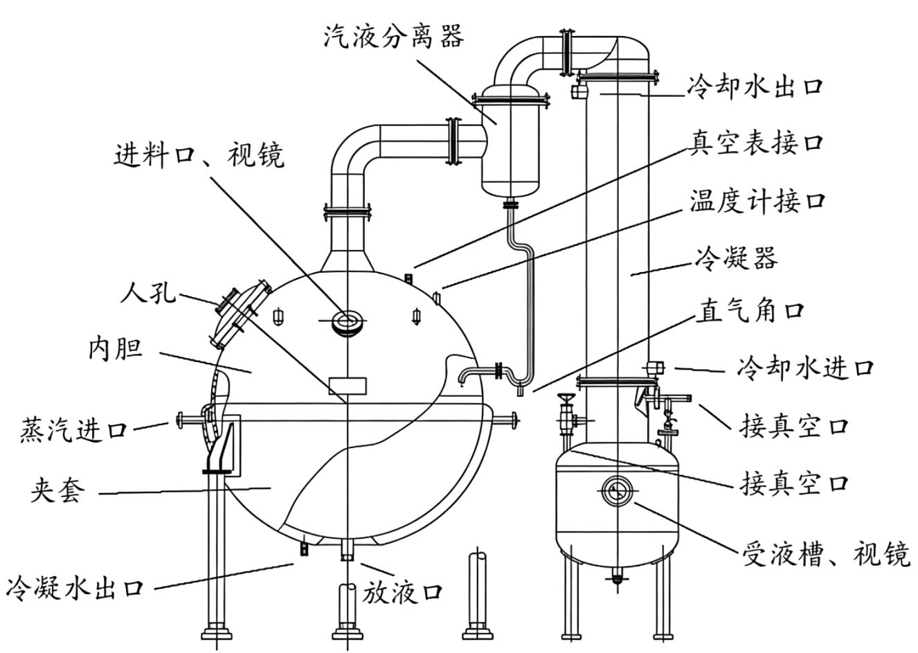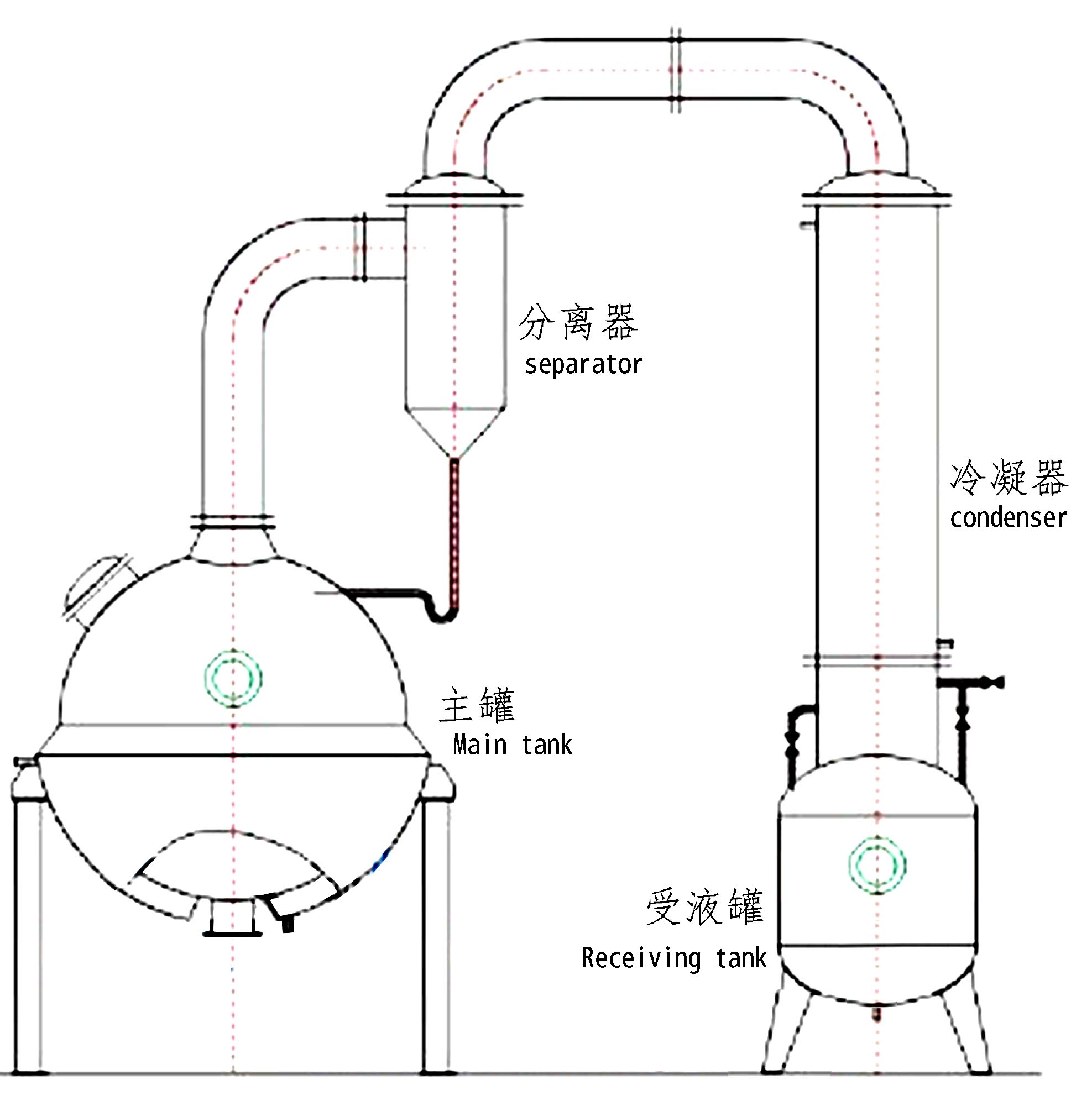 球形濃縮罐主要由濃縮罐主體、冷凝器、氣液分離器、受液桶四個部分組成,可用于制藥、食品、化工等行業對料液的濃縮、蒸溜及有機溶
